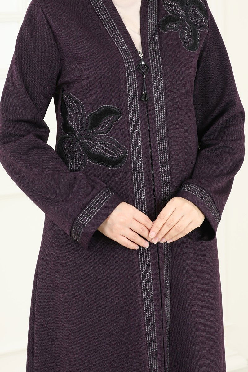 Detailed Processing Overcoat is a modest fashion item designed to be used in autumn and winter seasons. It requires dry cleaning only and is made from atlas fabric. The product has a V-neck collar and is unlined with a front zipper. (The product on the model is size 38.) Height: 160 cm, Chest: 86 cm, Waist: 68 cm, Hip: 95 cm, Weight: 55 kg. The embroidery details are sewn and the stones are not glued. Additionally, it has shoulder pads.
