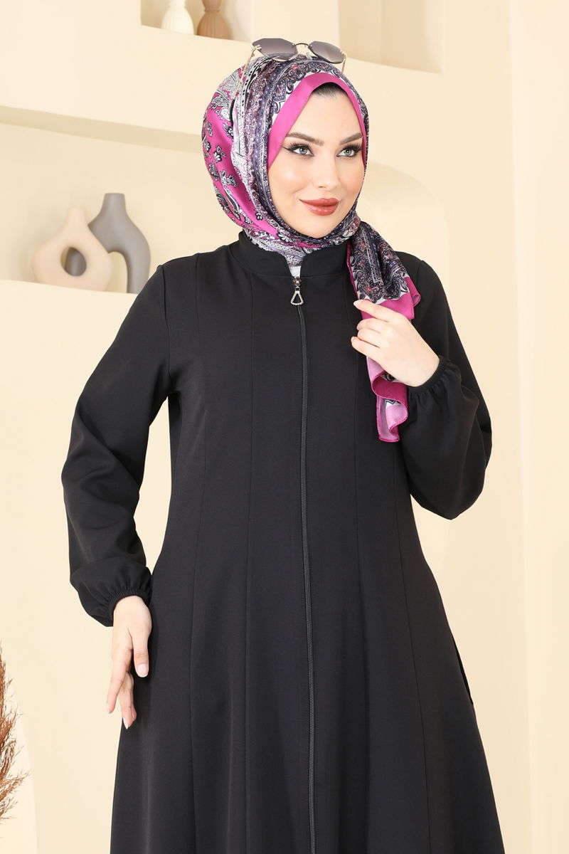 The Front Zippered Ferace Overcoat is a stylish, modest apparel made from durable dabıl fabric, suitable for all seasons. It's easy to maintain with its washable feature at gentle 30 degrees. This design has a half mandarin collar and is unlined for lightweight wear, with a convenient front zipper. Also, it includes pockets for practicality. The model wears size 38 with measurements: height 167 cm, chest 90 cm, waist 70 cm, hips 100 cm, and weight 59 kg.