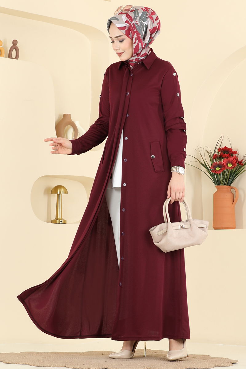 Elegant and functional, the Button Accessorized Knit Crepe Ferace is a modest wear model suitable for all seasons. This ferace, which can be gently washed at 30 degrees, is made from knit crepe fabric. It features a shirt collar and a lining-free design that provides a modern look. The accessible front buttons and hidden buttons offer practical usability. The buttons also serve as chic accessories. The piece includes pockets and active cuff buttons to enhance functionality. The product shown on the model is size 38.