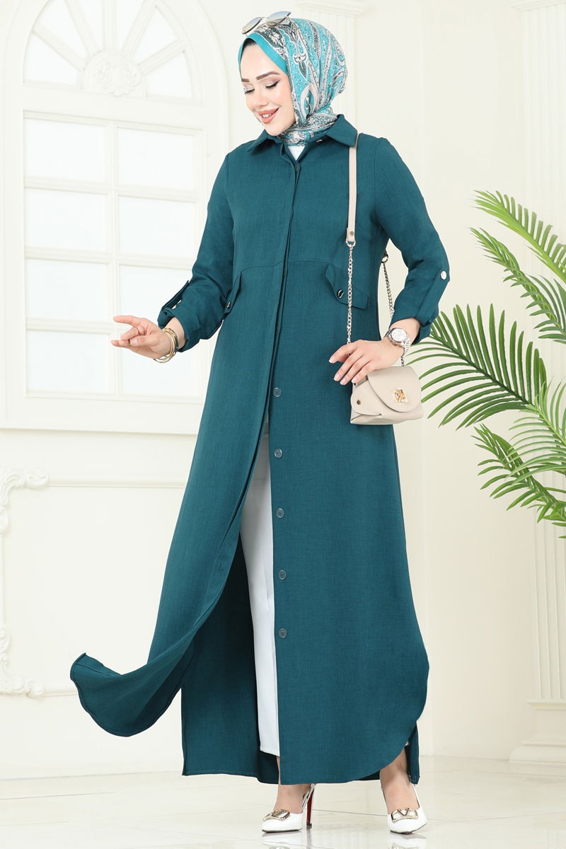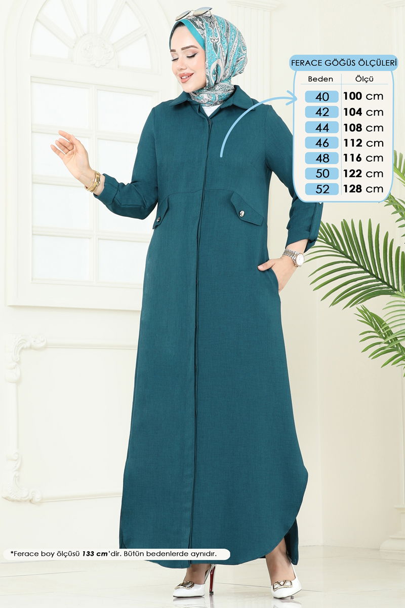 Our Ferace model hijab is comfortably usable in all seasons. You can wash it at 30 degrees with a gentle wash setting. It offers a comfortable experience with its hidden button and unlined design. The waist of the product is stitched, and stylish buttons are added as accessories. It features pockets and active cuff buttons for practical use.