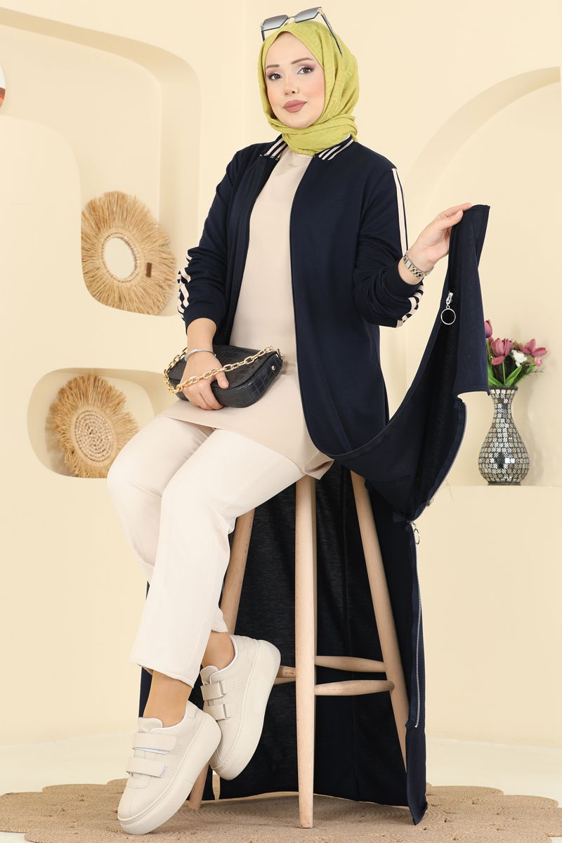 The Zip Slit Double Thread Ferace is specially designed for modest clothing. Its durable double thread fabric offers long-lasting use. Easily maintained with a gentle wash at 30 degrees, it features a semi-mandarin collar and a front zipper design that is both stylish and practical. The pocket detail adds extra comfort, while the slit detail enhances mobility. Its lining-free structure provides light and comfortable wear. The product is displayed in size 38 on the model.