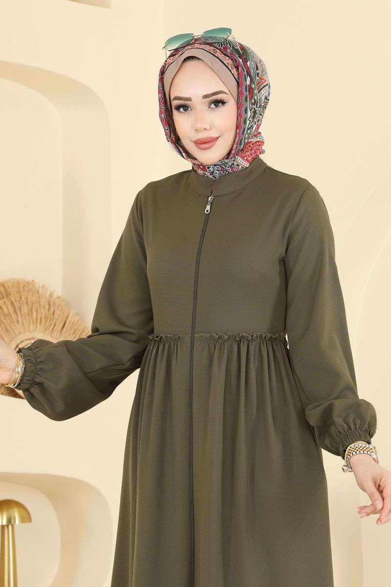 The Ruffled Waist Dabil Ferace is a high-quality Dabil fabric modest wear suitable for all seasons. It can be washed at 30 degrees with gentle care. This ferace offers comfort with its half-standing collar and lining-free design. The front zipper design and pocketed structure provide practical use, while its elastic-cuffed sleeves are easily adjustable. Its non-transparent material ensures comfort all day long.