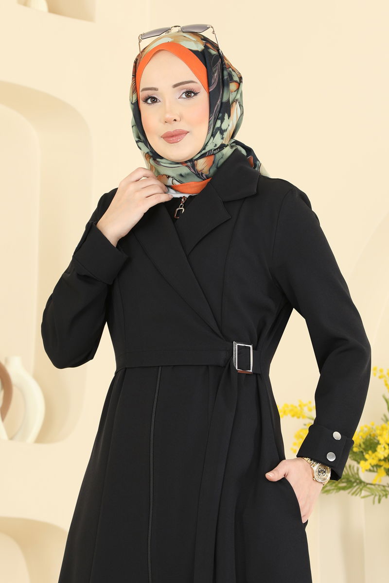 The Jacket Collar Dabıl Ferace is a modest clothing item suitable for all seasons. It can be washed at 30 degrees on a gentle cycle and is made from durable Dabıl fabric. The jacket collar adds a touch of elegance, while its lining-free design ensures lightness and comfort. Conveniently designed with a front zipper and hidden pocket details, it also features snap and buckle details that enhance its style. The product includes a sewn-in belt, offering a modern and chic silhouette.