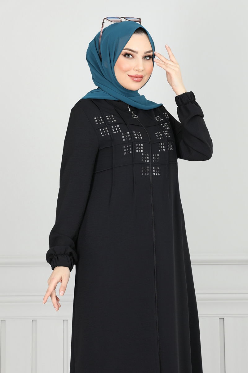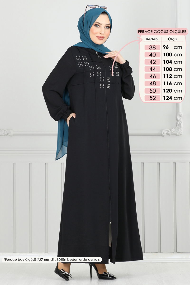The Stone Detail Muslim Cloak, with its Ferace model, can be comfortably worn in all seasons. It can be cleaned with a gentle wash at 30 degrees. Made from Aerobin fabric, this product features a semi-mandarin collar design. The lining-free cloak offers ease of use with a zipper at the front. The stones are adhesive, and the cuffs are designed with elasticity. With its stylish and practical design, it stands out in any setting. (The product on the model is size 38.)