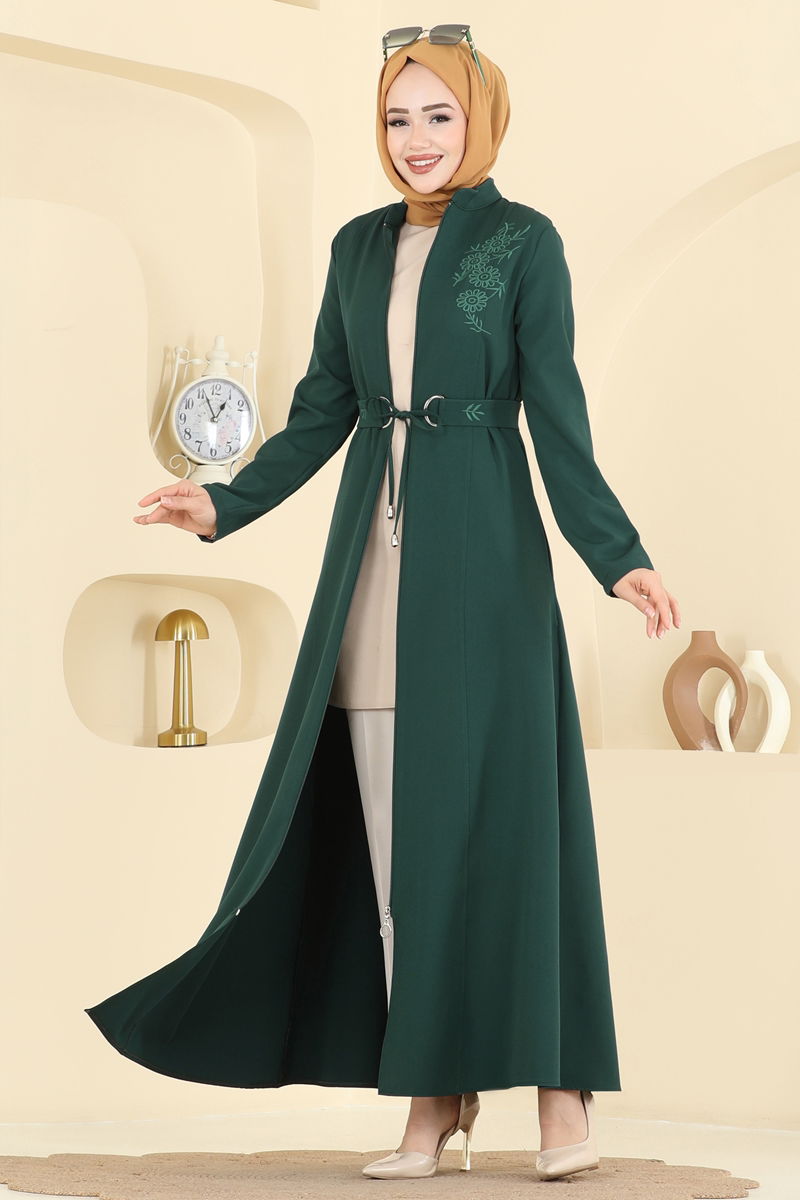 المنتج لديه ياقة نصف بيضوية. غير مبطنة. المنتج به سحاب في جزء من الأمام. يتم خياطة تفاصيل التطريز. الحزام متضمن، ،يمكن استخدامها حسب الرغبة الجيب متاح. قد يكون هناك اختلاف في الدرجة اللونية في المنتج بسبب التقاط الصور الفوتوغرافية.