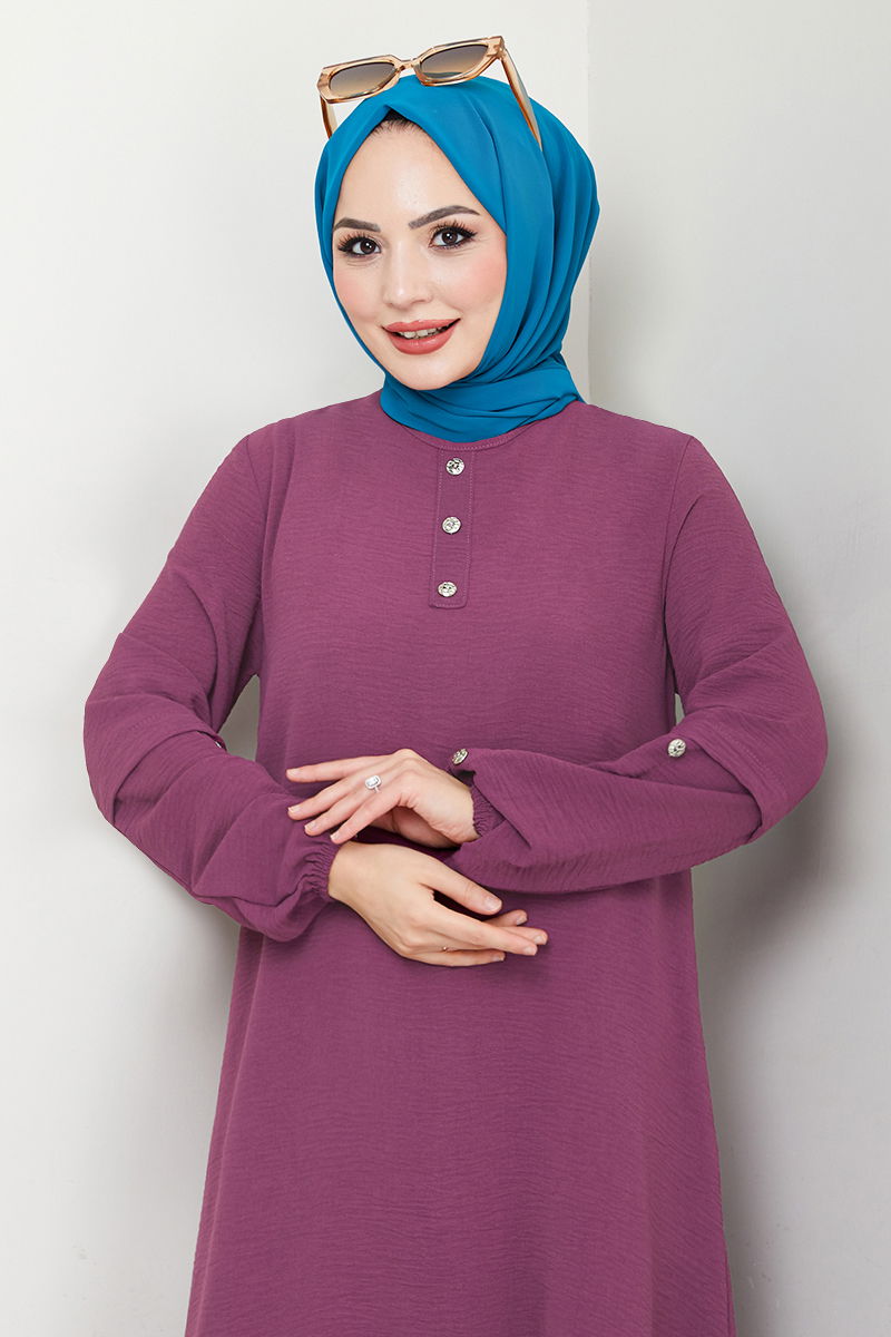 Accessoires Costume Boutonné Lilas Foncécombinez des produits Comprenant: Tunique et pantalon. Caractéristique du tissu: Il est fait de tissu aérobique. Il peut être utilisé en quatre saisons saisonnières. Caractéristique du produit: Le hijab de la nouvelle saison est un produit de mode. Le produit est un collier de vélo. Il n'est pas doublé. Les boutons sont des accessoires. La taille du pantalon est élastique. Le brassard est caoutchouté. Il peut y avoir une différence de tonalité dans le produit en raison de séances photo conceptuelles. Lavage: IL PEUT ÊTRE LAVÉ SANS SERRER À 30 DEGRÉS.(LAVAGE DÉLICAT) (Le produit sur le modèle est de taille 40.) Le costume avec boutons d'accessoires est un exemple élégant et stylé de vêtements hijab. Grâce au tissu aerobin, il peut être utilisé facilement en toutes saisons. Il peut être lavé à 30 degrés avec un lavage de précision. Les poignets élastiques et la taille élastique offrent une utilisation confortable dans la conception des tuniques et des pantalons. Les boutons attirent l'attention en tant qu'accessoire élégant. Ce produit est idéal pour les occasions quotidiennes et spéciales.Poids(Kg):0.62