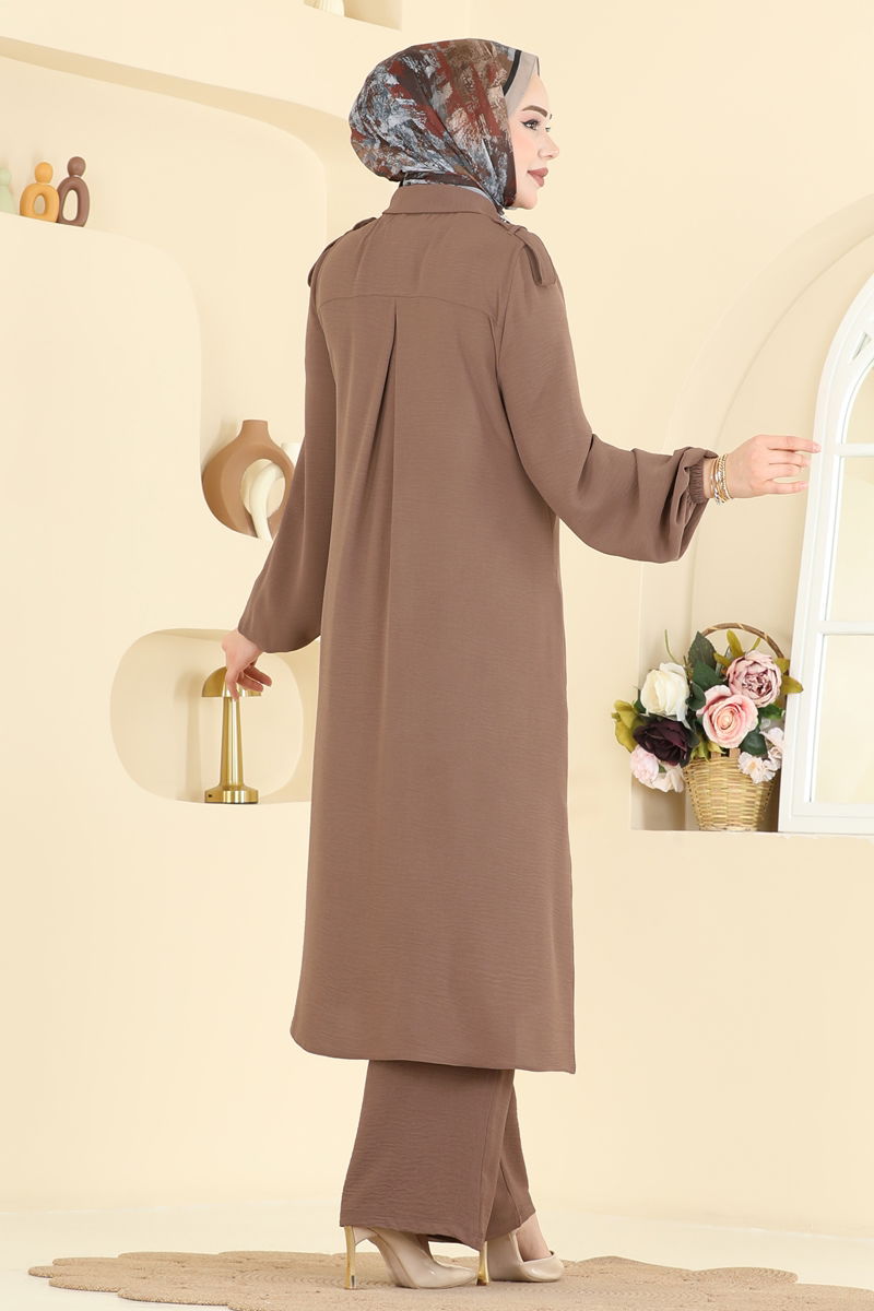 Ürün Özellikleri : Modaya uygun tesettür kıyafettir. Gömlek yaka tasarımına sahiptir. Ön kısmı düğmeli yapıdadır. Tunik yanlarda yırtmaç detaylıdır. Astarsızdır. Yan cepler estetik bir detay olarak eklenmiştir. Pantolonun bel kısmı lastiklidir. Pantolon paçaları lastiklidir.Renk tonları çekim koşullarına göre farklılık gösterebilmektedir.