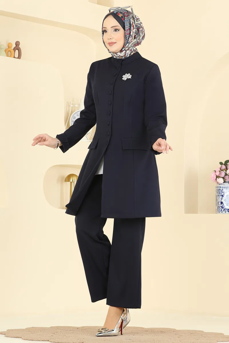 Ürün Detayları: Tesettür giyimde yeni sezon ürünüdür. Model yarım hakim yakalıdır. Ön kısmı düğmeli tasarıma sahiptir. Astar içermez. Cep ayrıntısı dekoratif aksesuar olarak kullanılmıştır. Pantolonun bel kısmında esneklik sağlayan lastik bulunmaktadır.Ürün fotoğraf çekimleri nedeniyle renk farklılıkları gözlenebilir.