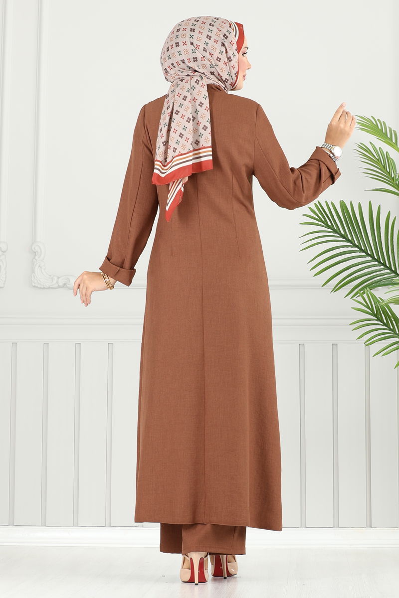 يوجد نصف أزرار متوفرة من الأمام. المنتج لديه ياقة بيضوية. غير مبطنة. تفاصيل الجيب من الملحقات. خصر البنطال مرن. قد يكون هناك اختلاف في الدرجة اللونية في المنتج بسبب التقاط الصور الفوتوغرافية.