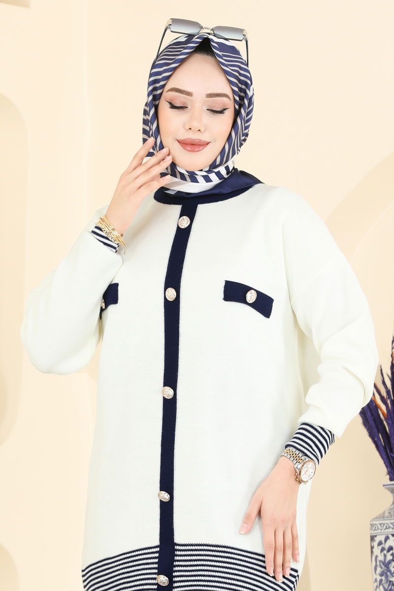 Ürün Detayları : Moda tasarımı tesettür üründür. Yaka bölgesi Yarım Hakim tipindedir. Astar içermemektedir. Süs amaçlı düğmeler bulunmaktadır. Eteğin beli lastiklidir.Ürün fotoğraflarındaki renk tonları ışık koşullarına bağlı olarak farklılık gösterebilir.
