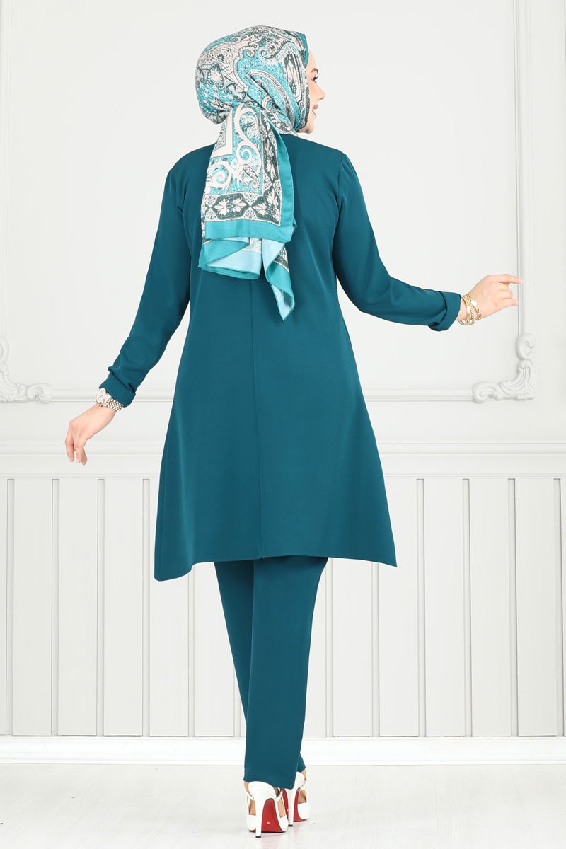 The Accessory Buttoned Hijab Suit is a chic option for all seasons. It offers practical use with its feature of being washable at 30 degrees with delicate wash. Made from Dabil fabric, this suit provides comfortable wear with its bicycle collar design and lining-free structure. Its zipper at the back makes it easy to wear and take off. Designed as a tunic and trousers, this model offers a comfortable fit with the elastic at the waist of the trousers. The buttons are added as decorative details only. The product on the model is size 40.