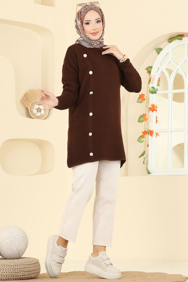 Tesettür Triko Tunik - Kahverengi Düğme Detaylı