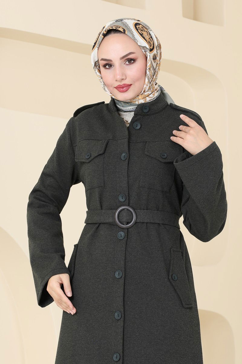 المنتج لديه ياقة بيضوية. المنتج به أزرار من الأمام. غير مبطنة. الحزام متضمن، ،يمكن استخدامها حسب الرغبة الجيب الصدري نشط. قد يكون هناك اختلاف في الدرجة اللونية في المنتج بسبب التقاط الصور الفوتوغرافية.