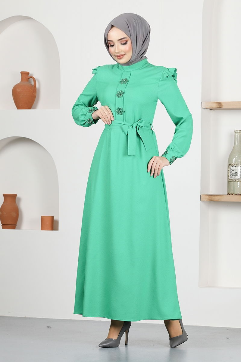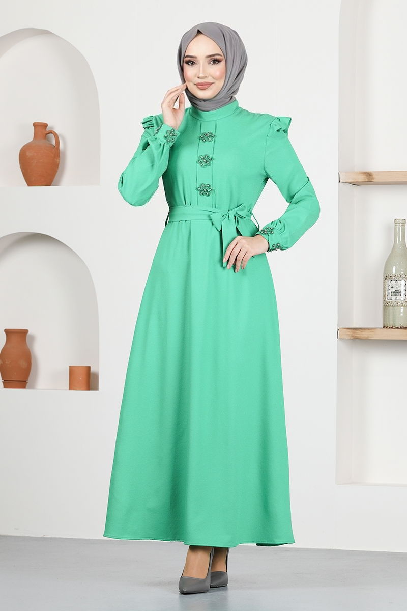 Ürün Özelliği        : Yeni sezon üründür. Ürün yaz sezonu ürünüdür. Arka kısmından gizli fermuarlıdır. Kol manşetleri aktif düğmelidir. Ön ve kol kısımlarında boncuk detaylar kullanılmıştır. Kemer seyyar olup ürün ile birlikte gönderilmektedir.