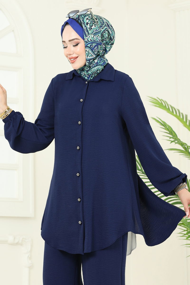 Product Feature : It is a new season hijab fashion product. There is a zipper that can be used from the back. The fabric on the back body is garni fabric and is sewn onto the product.The product has a Shirt collar. The product has From the front buttons. Unlined. The product has a zipper at the from the back part. The waist of the trousers is elastic. The cuff is rubberized. There may be a tonal difference in the product due to concept photo shoots.