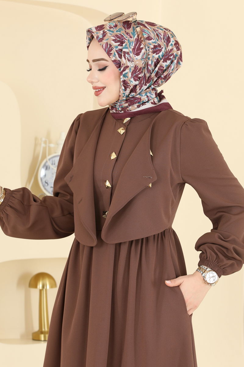 Asimetrik Düğmeli Dabıl Elbise 2805SL432-MS Kahve