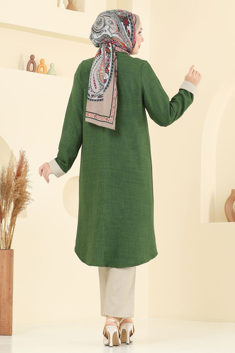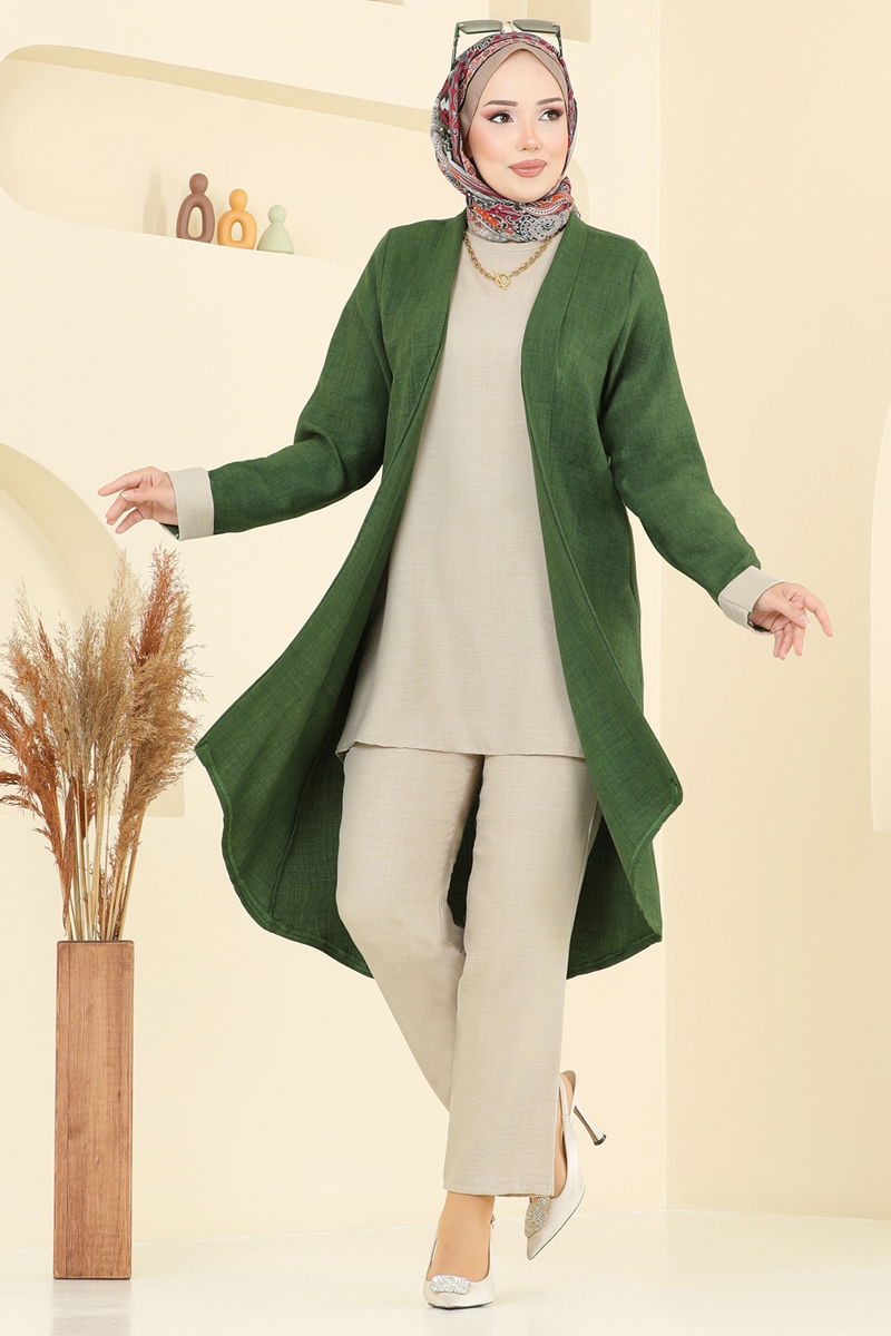 The Asymmetric Cut Three-Piece COMBINATION is an elegantly designed modest wear outfit made from sofia linen, suitable for all seasons. It features a liner-free crew neck, sleeveless inner tunic, and an elastic waist on the pants. Offering both style and comfort, this set can be washed at 30 degrees on a gentle cycle. The practical buttoned back makes it easy to wear, ensuring it becomes a favorite in your wardrobe with its perfect fit and chic design.