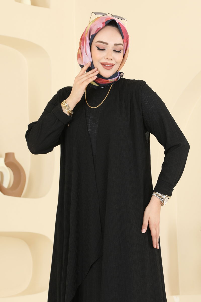 Siyah Asimetrik Yelek ve Örme Elbise Takımı