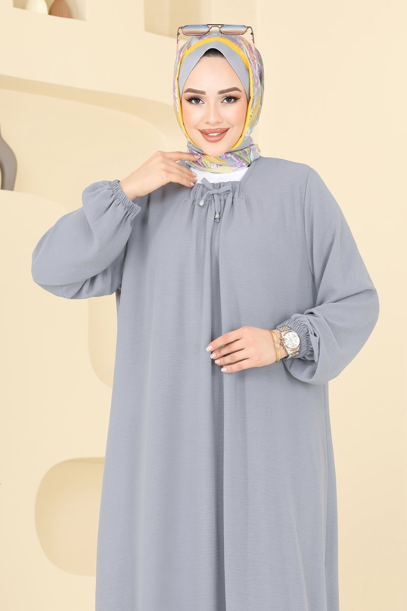 Ürün Detayları : Tesettür modasına uygun yeni sezon ürünüdür. Elbise baştan geçirilecek şekilde tasarlanmıştır. Ürünün yakası bisiklet tipindedir. Astarı bulunmamaktadır. Bağcık ayrıntıları dekoratif bir elemandır. Kol ağızları lastiklidir. Fotoğraf çekimleri sebebiyle renkte küçük farklılıklar gözlenebilir.