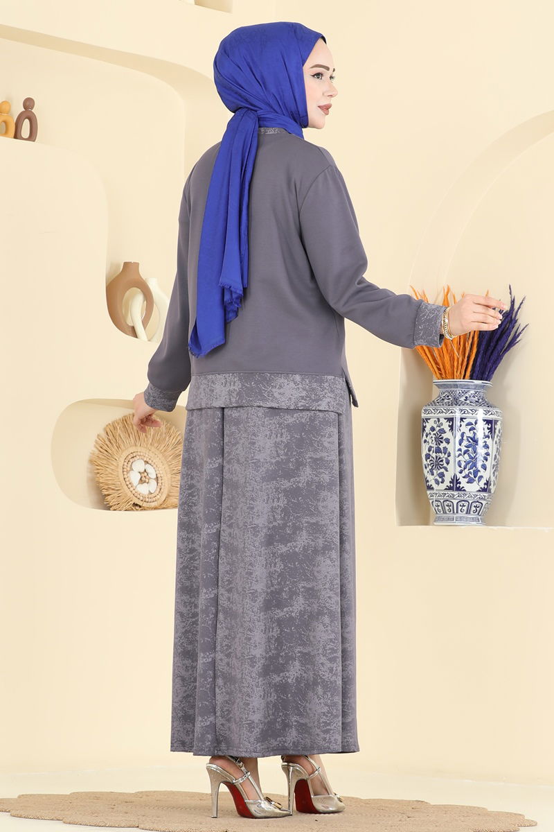 'Bu antrasit renkli, baskılı modal tesettür takım, dört mevsim boyunca konforlu bir giyim fırsatı sunar. Özel olarak seçilmiş modal kumaşı ile hem rahat hem de şık bir seçenektir. Modern tasarımda bisiklet yakalı tunik ve yan yırtmaçları ile dinamik bir silüet sergiler. Elastik bel özelliği eteği her daim rahat kılar ve giysiye şık bir görünüm kazandıran arma detayları ile tamamlanmıştır. 30 derecede hassas yıkama önerilen bu ürün uzun süreli kullanımlara uygundur.'