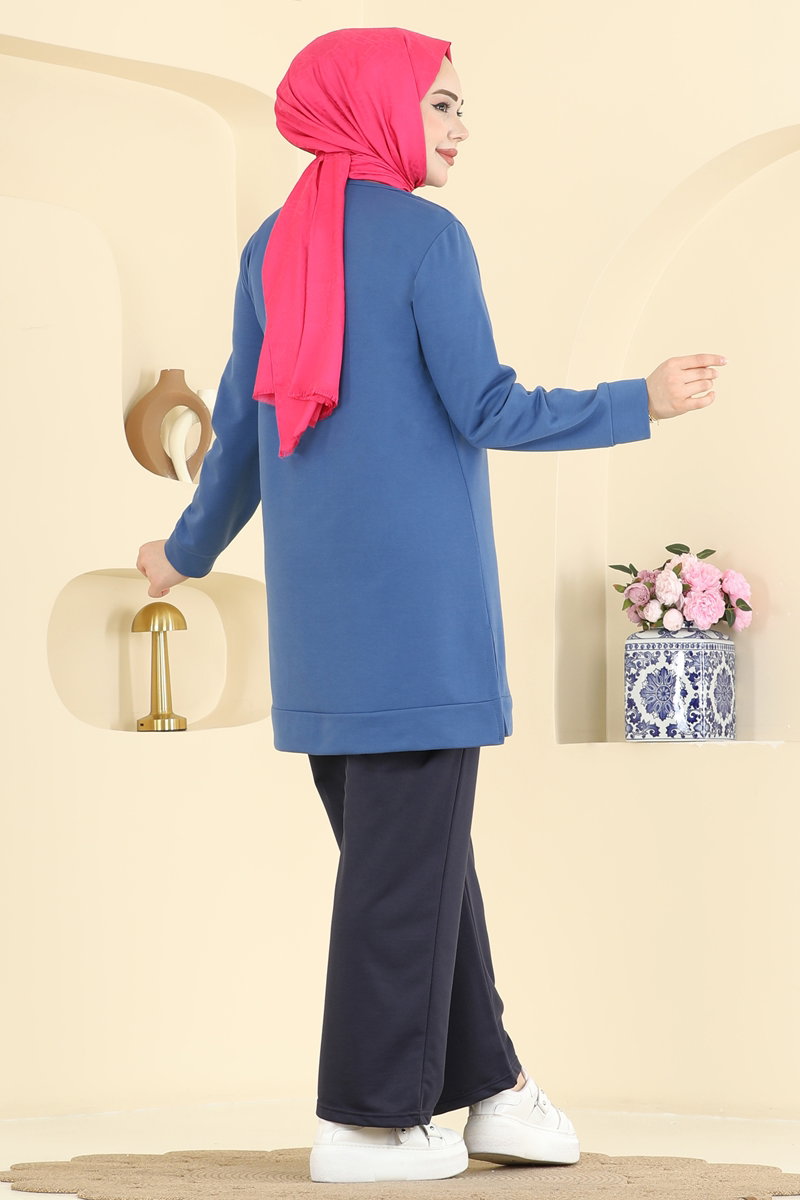 Bu sezona özel tasarlanmış Indigo ve Laci renklerinin zarif kombinasyonu ile dikkat çeken Baskı Detaylı Spor Takım, şıklığınızı arttırırken konforunu da ihmal etmiyor. Dört mevsim tercih edebileceğiniz bu tesettür takım, kaliteli iki iplik kumaşı sayesinde ideal bir kullanım sunar. Baskılı detaylara sahip tunik yan yırtmaçlara ve bisiklet yakaya sahipken, pantolon ise esnek beli ile rahat bir kullanım sağlar. Baskıların daha uzun ömürlü olması için ürünü yıkarken ters çeviriniz ve bu şekilde ütüleyiniz.