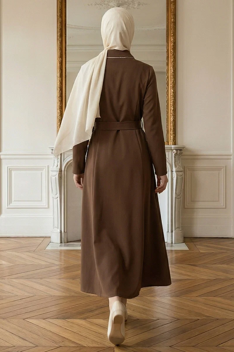 Kahverengi Bebe Yaka Düğmeli Elbise