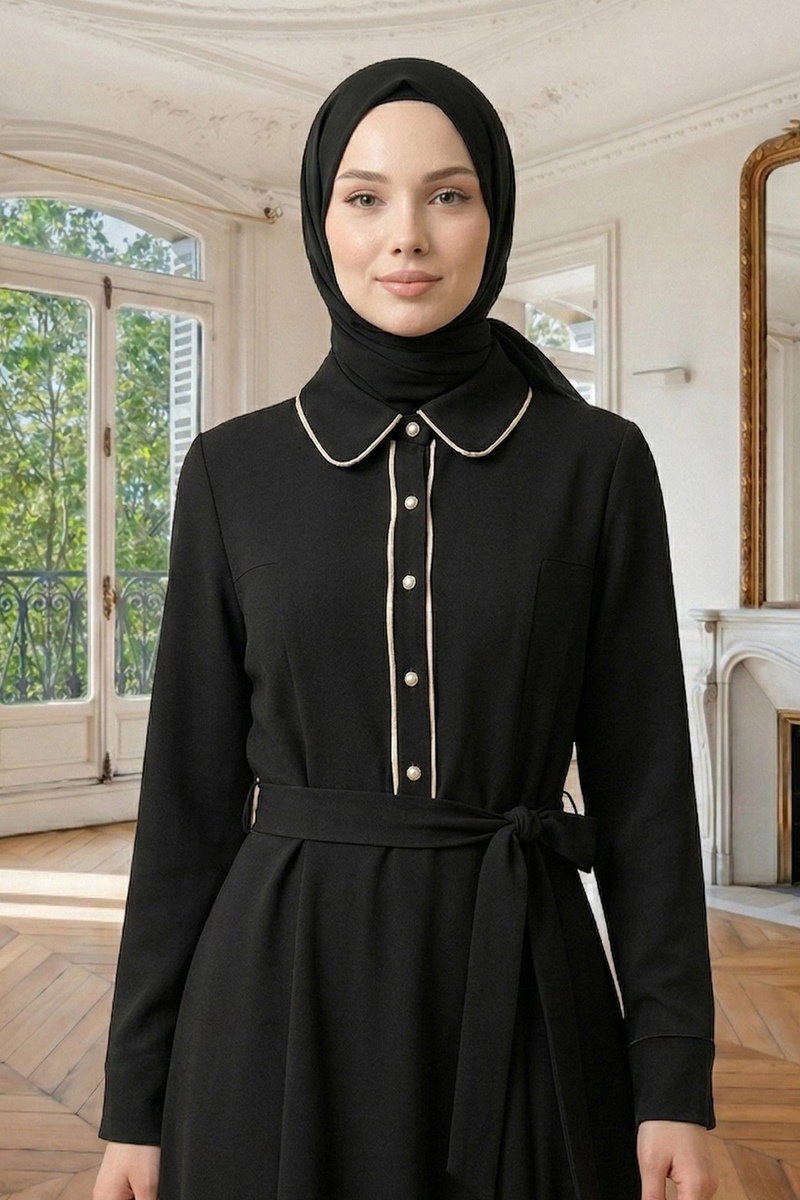 Siyah Bebe Yaka Düğmeli Elbise, düğmeli yarım ön kısmı ve şık yaka tasarımı ile dört mevsim tercih edilebilen bir tasarımdır. 30 derecede hassas yıkamaya uygun olarak tasarlanan bu elbise, dabıl kumaştan üretilmiştir. Bebe yakası ve astarsız dizaynı ile konforlu bir kullanım sunar. Elastik olmayan kemer, isteğe bağlı olarak kullanılabilir veya çıkarılabilir. Elbisenin boyu, beli ve göğüs ölçüleri mevcut olup, kemer detayı eklenmiş dikişsiz bir tasarıma sahiptir.