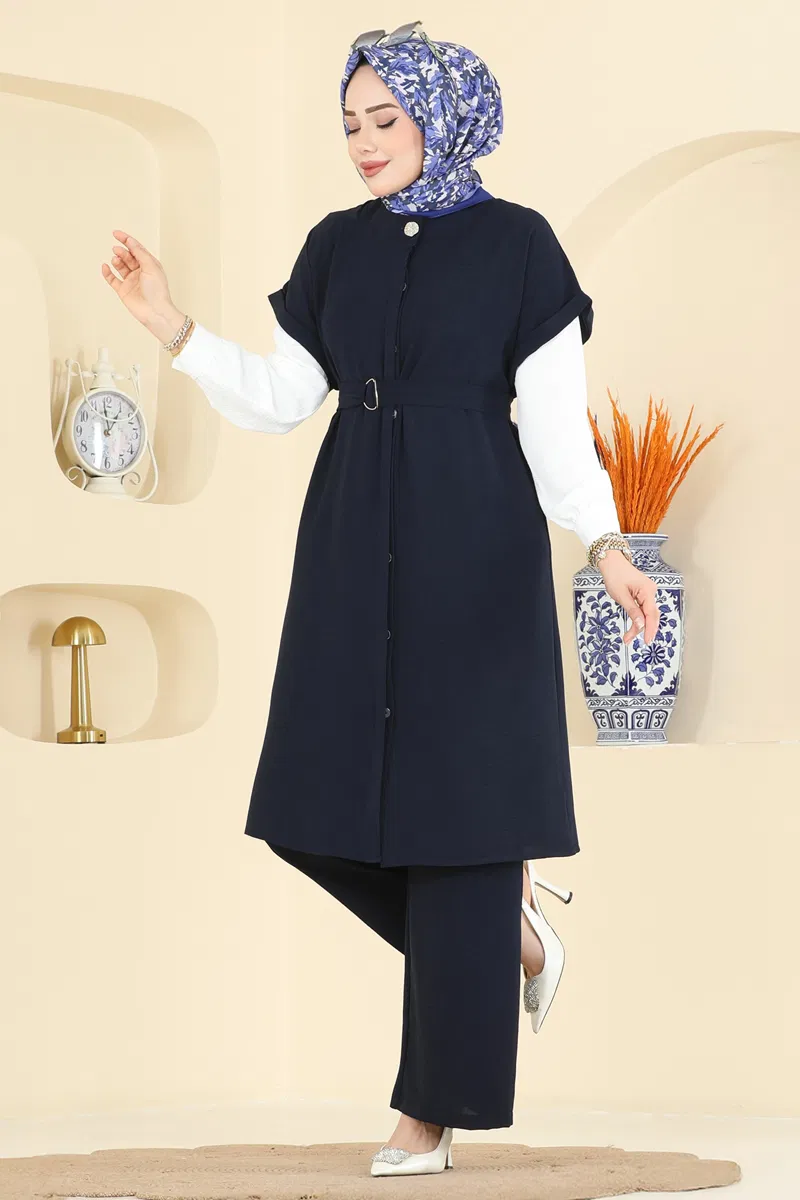 Ürün Açıklaması: Bu ürün yeni sezon tesettür modasına uygun olarak tasarlanmıştır. Gizli ve açık düğmeleri mevcuttur. Gömlek tipi yaka kullanılmıştır. Ürün düğmelerle kapanmaktadır. Kemer bu sete dahildir ancak kullanımı opsiyoneldir. Pantolonun bel kısmı elastiktir. Manşetler aktif düğme detaylarına sahiptir.Fotoğraflama ayarlarından dolayı renk tonlarında farklılıklar olabilir.