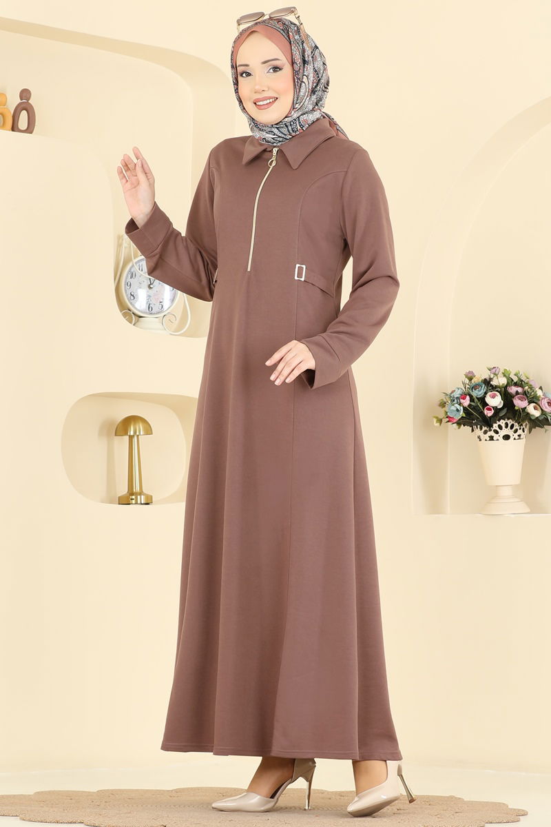 Pudra rengi belden toka ile süslenmiş bu elbise, tesettür giyim için ideal, her sezon tercih edilebilecek bir modeldir. İki iplik kumaş sayesinde rahatlık sunan elbise, gömlek yakası ve önden fermuarı ile pratik kullanım sağlar. Toka detayı ise şıklığınızı artırır. 30 derecede hassas yıkama yapılabilen bu model, astarsız yapısı ile hafiftir. Modelin giydiği elbise 38 bedendir.