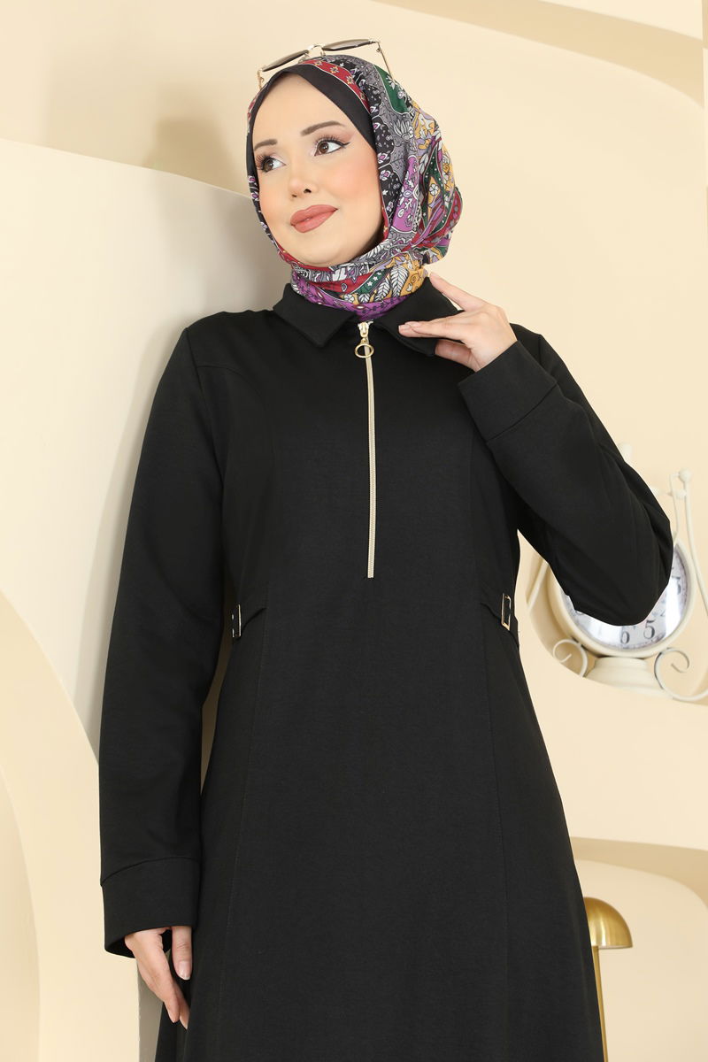 Toka kemer detayına sahip bu siyah elbise, tesettür giyime uygun ve her mevsimde keyifle kullanılabilir. İki İplik kumaştan üretilen elbise, şık bir gömlek yaka ve pratik ön fermuar detayı ile dikkat çeker. Toka detayı ile özgün bir stil sunan elbise, astarsız yapısı sayesinde rahat bir kullanım sağlar. 30 derecede hassas yıkama yapılabilmektedir ve modelin üzerindeki ürün 38 bedendir.
