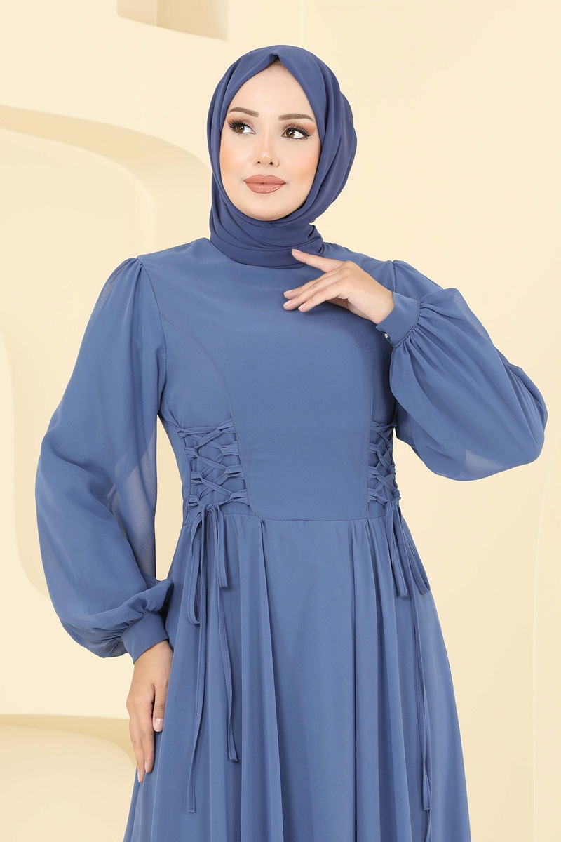 Beli Bağcık Detay Şifon Abiye 6238BSK463-MS İndigo