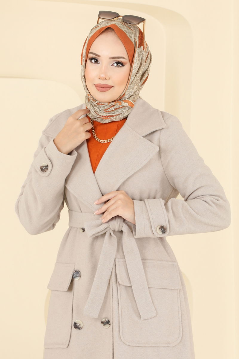 The Belted Woolen Coat is a winter coat designed specifically for modest fashion. It can be comfortably used in autumn and winter seasons. The special wool fabric, crossover collar, and half-buttoned front design offer both style and comfort. The coat is unlined and the product displayed is size 38. The belt can be adjusted to fit various sizes and can be optionally removed. Practical pocket details and active cuff buttons provide functional use. It should be dry cleaned only.