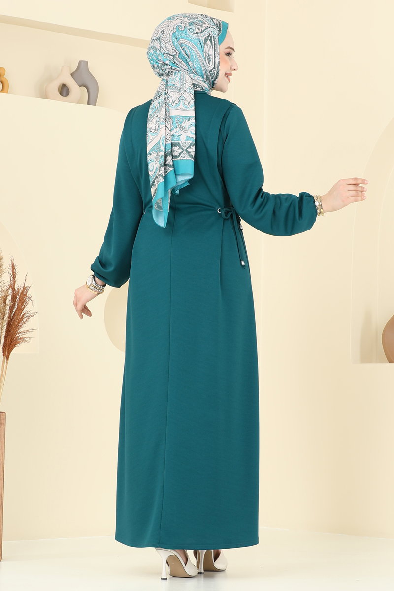 Elbise Detayları: Tesettür modasına uygun, yeni sezon tasarımıdır. Kafadan geçirme tarzında, beli bağcıklı, bisiklet yakalı ve astarsızdır. Aksesuarlar fiyata dahil değildir. Kollar lastikli yapıdadır. Renk tonlarında çekim koşullarına bağlı değişiklikler olabilir.