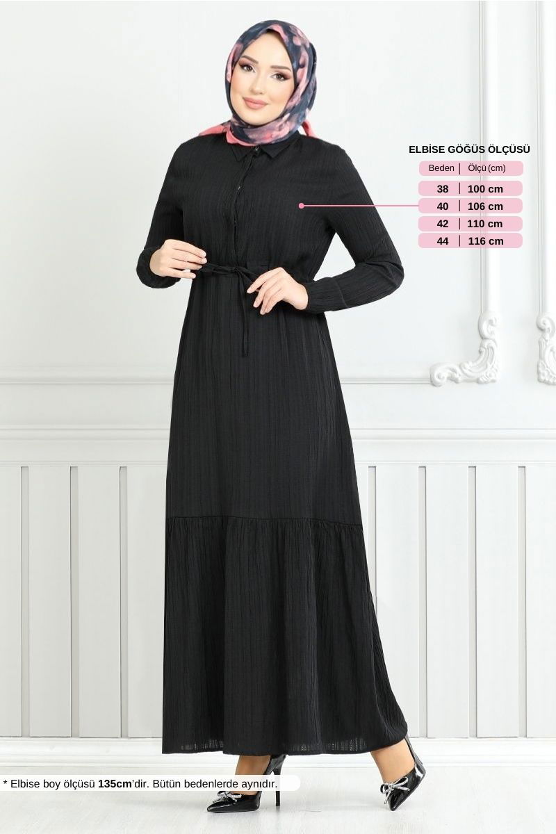 Beli Bağcıklı Tesettür Elbise 779ASE1099-M Siyah