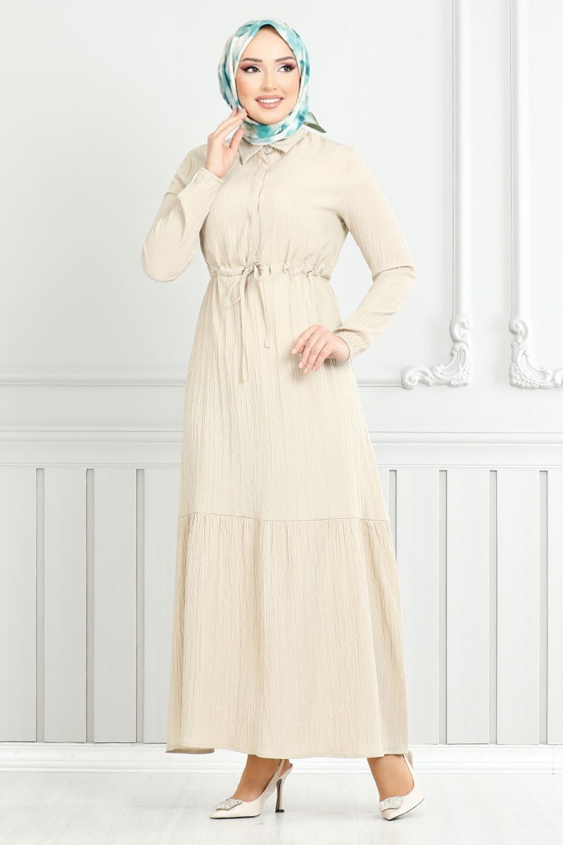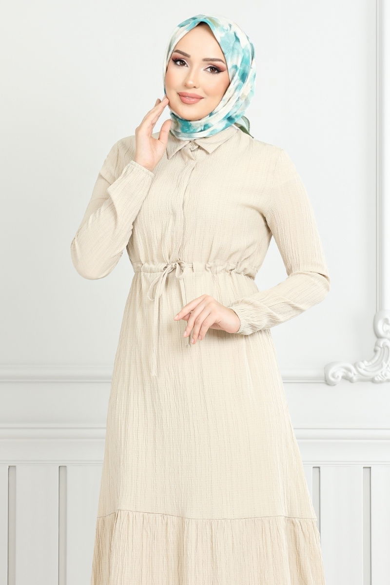 Hijab Dress with Lace-up Waist Feature of TaşKumaş : It is made of Tree Bark fabric. It can be used in Four Seasonal seasons. Product Feature: New season hijab is a fashion product. The waist is laced. The product is a Shirt collar. The product has a half button that can be used from the front. It is unlined. The cuff is rubberized.There may be a tonal difference in the product due to concept photo shoots. Washing : IT CAN BE WASHED WITHOUT TIGHTENING AT 30 DEGREES.(DELICATE WASHING) (The product on the model is size 38.) Hijab Dress with Lace-up Waist: This dress, which you can use easily in all seasons, has a long service life with its delicate washing feature at 30 degrees. It is made of tree bark fabric and is modern and convenient with its shirt collar design and half-buttoned structure from the front. This unlined model offers a feminine silhouette with its lace-up waist design. The product is represented by a model over size 38.Weight (Kg):0.52
