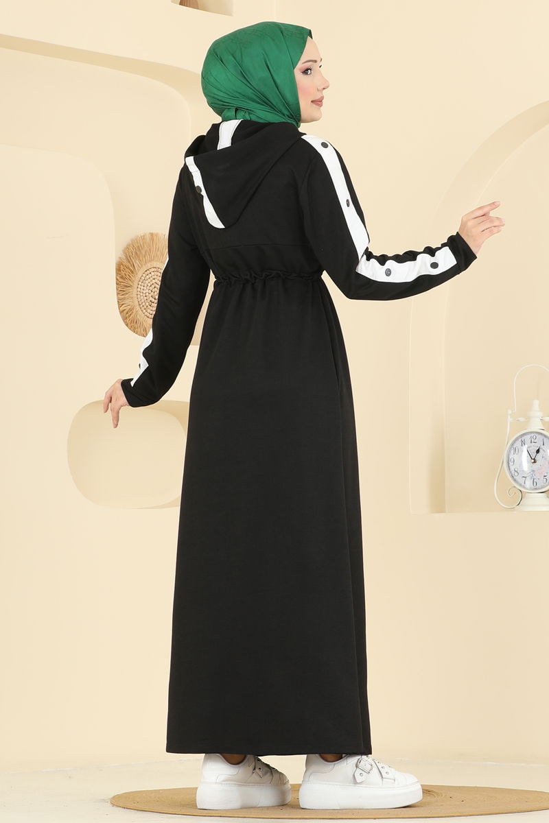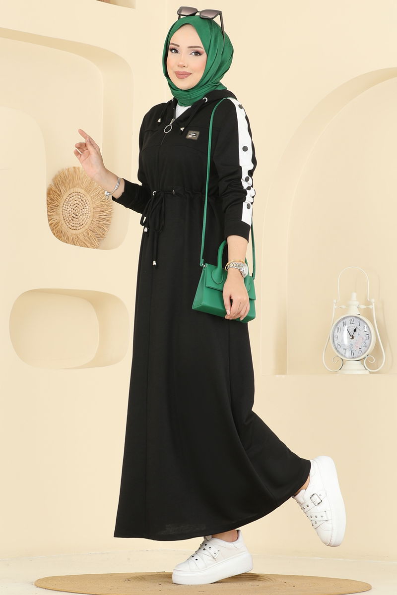 Kara Tünel Ayrıntılı Elbise, tesettür tasarımı ile yılın her mevsimi keyifle tercih edilebilir. İki iplikli özel kumaş kullanılarak hazırlanan bu elbise, şıklık ve konforu bir arada sunuyor. 30 derecede nazik şekilde yıkanabilen bu parça, kapşonlu ve astarsız yapısıyla çağdaş bir stil vaat eder. Bağlama ipi ve arma detayı ile göz dolduran bu tasarım, her durumda ilgi odağı olmaya hazırdır. Üzerindeki ürün beden 38'dir.