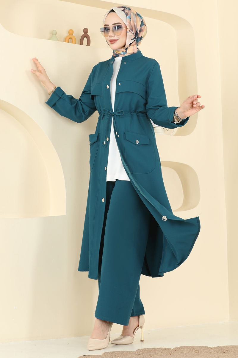 Ürün Açıklaması: Modern tesettür modasına uygun yeni sezon ürünü. Beli ayarlanabilir ip detayına sahiptir. Ürün Yarım Hakim yaka tasarıma sahiptir ve önü düğmeli kapatılır. Astarsızdır ve cep detayı bulunmaktadır. Pantolonun beli elastiktir. Fotoğraf çekimlerinin ışık ayarlarından dolayı renkte farklılıklar olabilir.