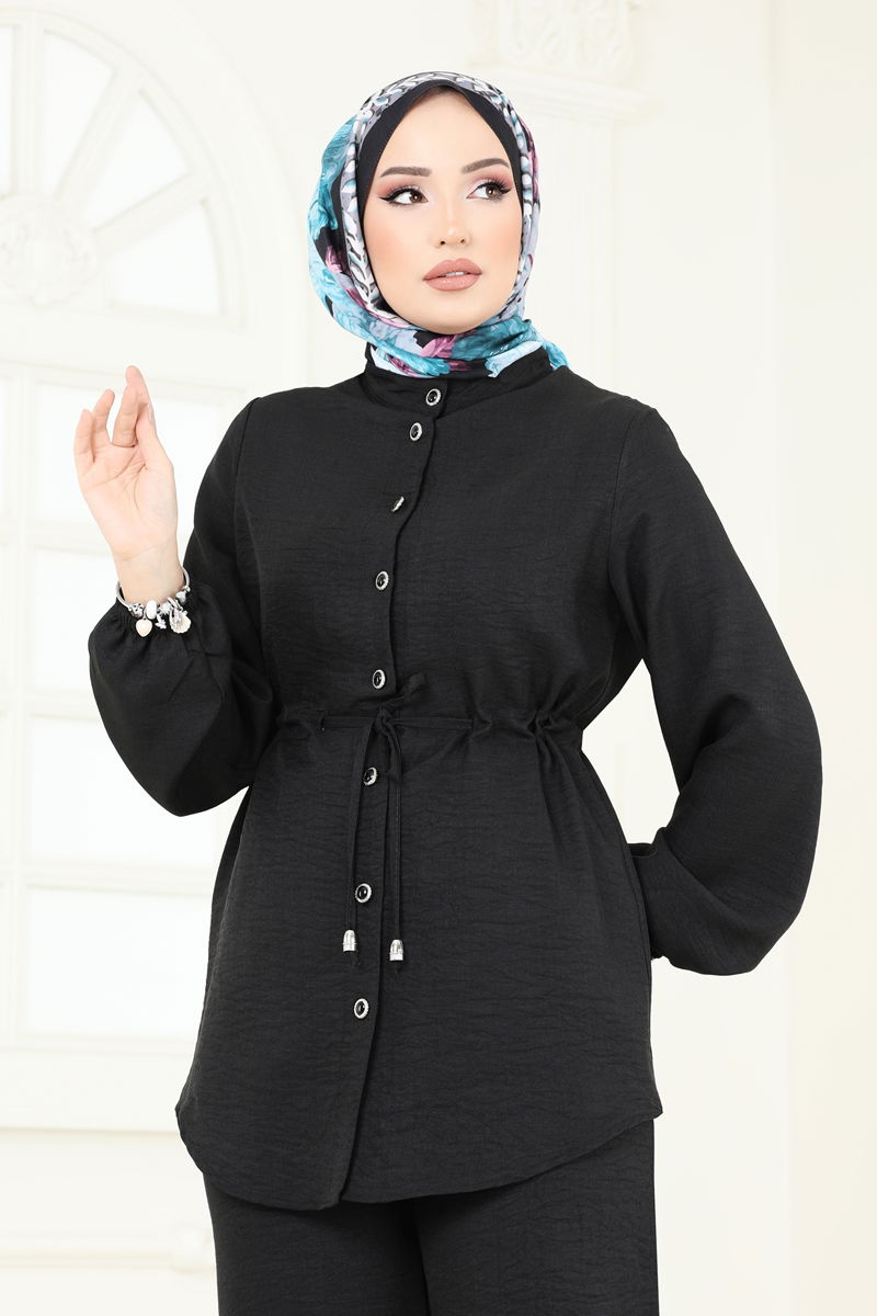 يتميز بخصر ذو أربطة. المنتج لديه ياقة نصف بيضوية. المنتج به أزرار من الأمام. غير مبطنة. الملحقات غير متضمنة. البلوزة غير متضمنة. صُنعت عينة من المجموعة مع البلوزة لإظهار الاستخدام المقصود للمنتج. خصر البنطال مرن. السوار مطاطي. قد يكون هناك اختلاف في الدرجة اللونية في المنتج بسبب التقاط الصور الفوتوغرافية.