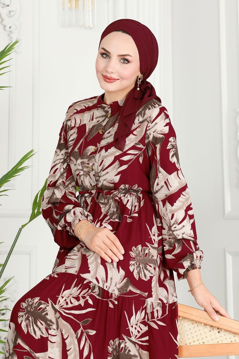 Beli Tünelli Viskon Elbise 7119BG354-MS Bordo