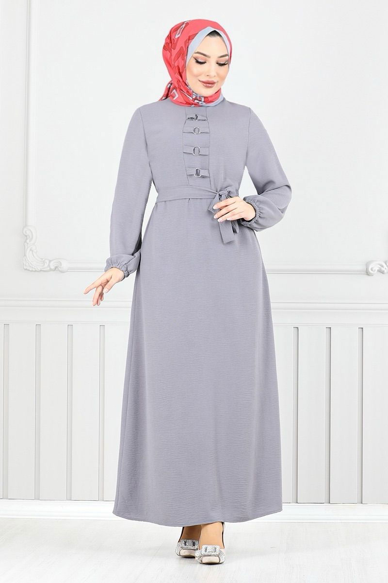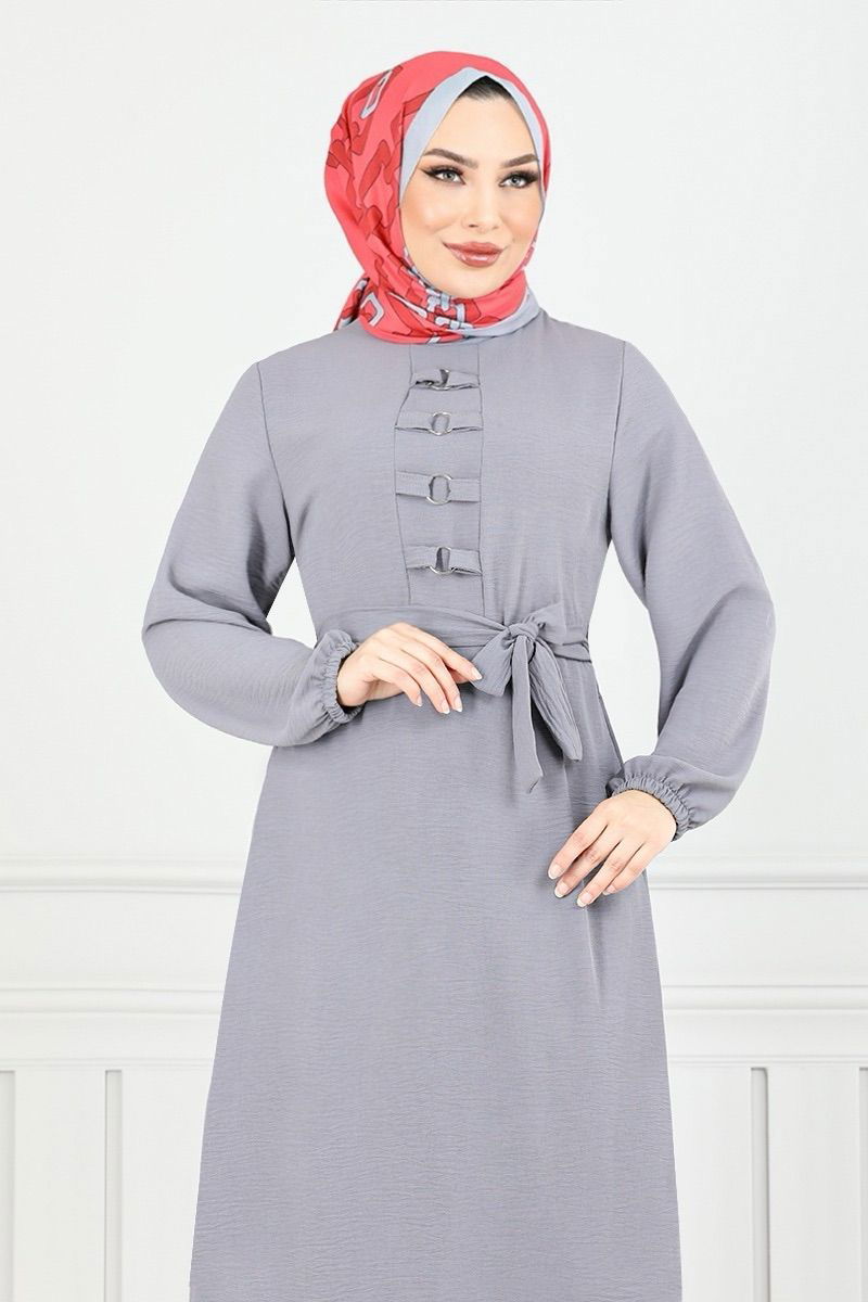 Aerobin Dress with Belt GriKumaş Feature: It is made of aerobin fabric. It can be used in Four Seasonal seasons. Product Feature: New season hijab is a fashion product. The product is the dominant collar. It is unlined. The product is zipped from the back. The details are sewn up. The belt is included in the product, it may not be used on request. The cuff is rubberized.There may be a tonal difference in the product due to concept photo shoots. Washing : IT CAN BE WASHED WITHOUT TIGHTENING AT 30 DEGREES.(DELICATE WASHING) Belt Feature: The two ends of the belt are sewn so that it does not fluctuate, the middle part is left empty (seamless). (The item on the model is size 38.)Weight (Kg):0.57
