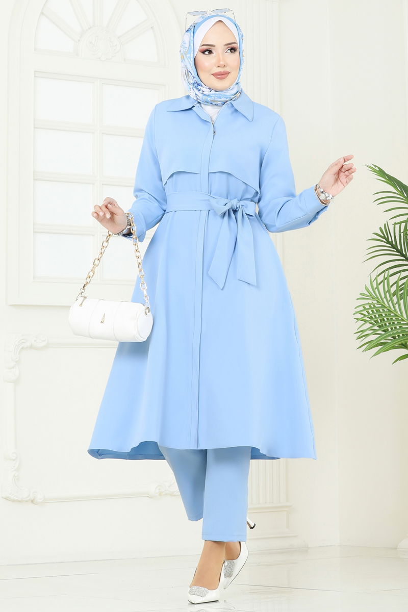 Ürün Özellikleri: Yeni sezon modasına uygun bir tesettür modelidir. Gömlek tipi yakalıdır, astarsız ve ön kısmı fermuarlıdır. Ürüne eklenen kemer isteğe bağlı olarak çıkarılabilir. Pantolonun bel kısmı lastikli tasarıma sahiptir ve manşet düğmeleri fonksiyoneldir. Fotoğraf çekimlerinden ötürü renk tonlarında farklılık görülebilir.
