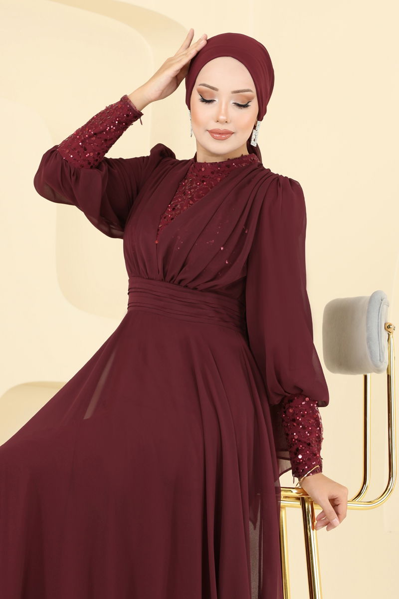 Boncuk Detaylı Şifon Abiye 5703EDF311-MS Bordo