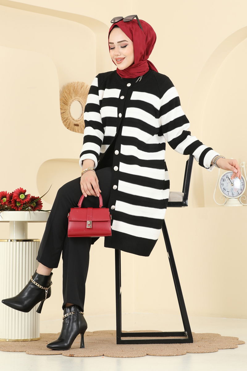 Warm up your autumn and winter days with the Button Detail Cardigan, a stylish option for modest fashion. Made from mercerized knit fabric, this product can be cleaned at 30 degrees with gentle wash, making it ideal for prolonged use. With its bike collar and front button details, it adds a modern touch, while its lining-free design offers light and comfortable wear. The model with standard size measurements can adapt to all types of physical structures. This chic cardigan is the perfect choice for those who do not want to compromise their elegance on cold days.