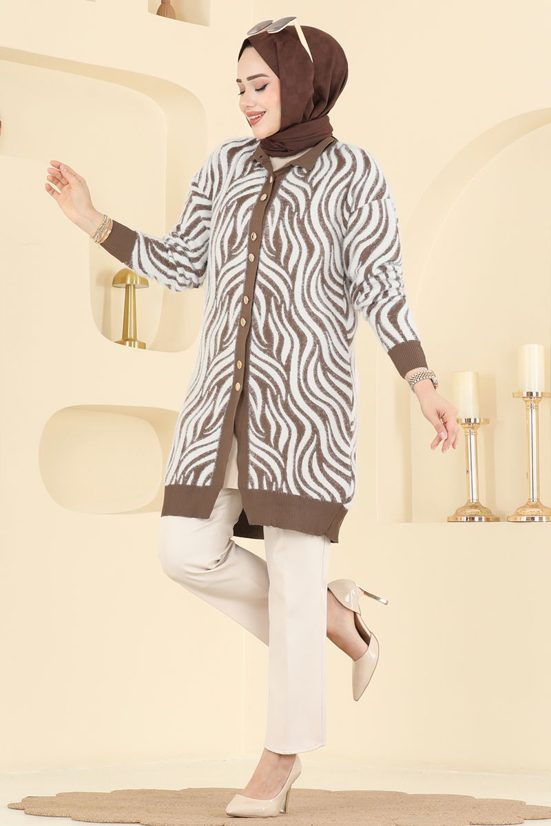 Chic and modern: Zebra Patterned Knit Cardigan! This cardigan, designed for hijab fashion, will keep you warm during the autumn and winter months and is suitable for gentle wash at 30 degrees. Its soft knitted fabric, comfortable mandarin collar, and practical front buttons offer both comfort and style. Ideal for everyone with standard sizes (36-38-40-42-44)!