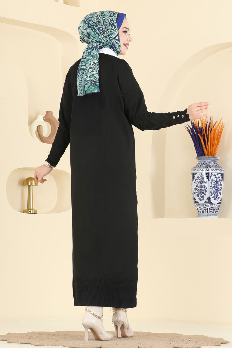 Product Name: Accessorized Buttoned Mercerized Cardigan. This HIRKA model is suitable for modest dressing and can be comfortably used in all seasons. It can be washed at 30 degrees on a gentle cycle without spinning. Made from mercerized knit fabric, this elegant cardigan features a V-neck design. It is buttoned down the front, has slit details, and is unlined. The product is in standard size, suitable for sizes 38-40-42. The buttons on the cuffs are designed as chic accessories.