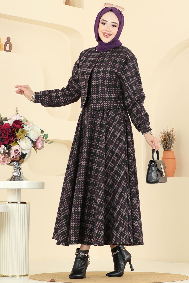 The Jacketed Winter Hijab Suit COMBINE model is a hijab product. It can be used in Autumn and Winter seasons. It should be washed at 30 degrees without squeezing. It is made of first-class Winter Knitted fabric. The product has a Bicycle collar and is buttoned from the front. It is liningless. The product has a side zip. (The product on the model is size 38.) The skirt waist is side-zipped and half elasticated. JACKET and SKIRT