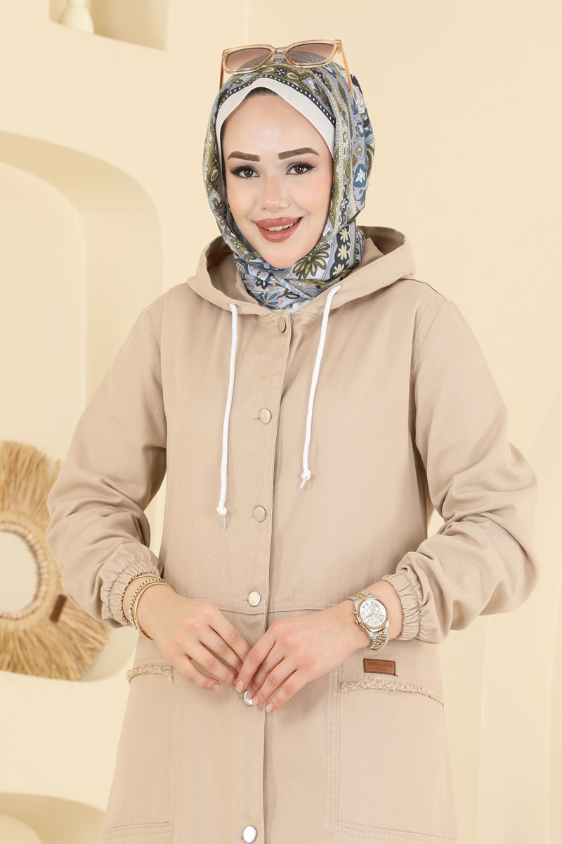 Ürün Detayları:Yeni sezon tesettür modasına uygun bir üründür. Bağcıklı yaka tasarımına sahiptir. Kapşonlu bir yapıdadır. Önden düğmeli kapanışa sahiptir. Astarı olmayan, iç bölümü az gösteren bir tasarımdır. Bel kısmı dikişli ve arma ile süslüdür. Cep detayı mevcuttur. Manşetleri lastikli yapıdadır.Fotoğraf çekimlerindeki ışık nedeniyle renk tonlarında farklılık görülebilir.