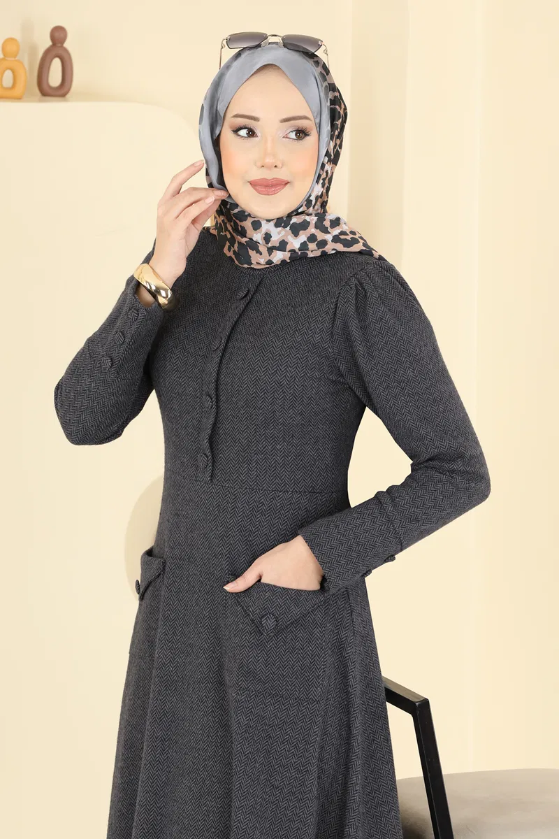 Antrasit Balık Sırtı Desenli Elbise Detaylı Cep