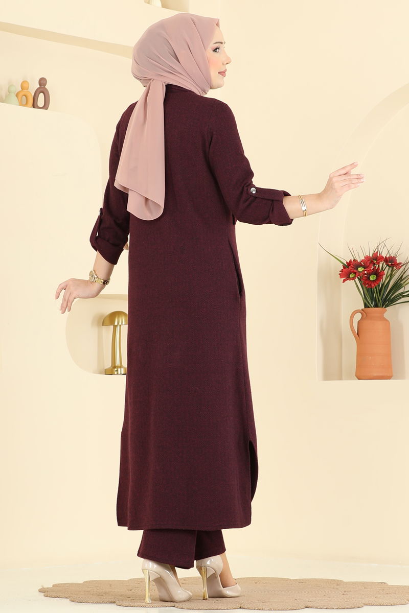 Bordo Balıksırtı Desenli Tesettür Takım