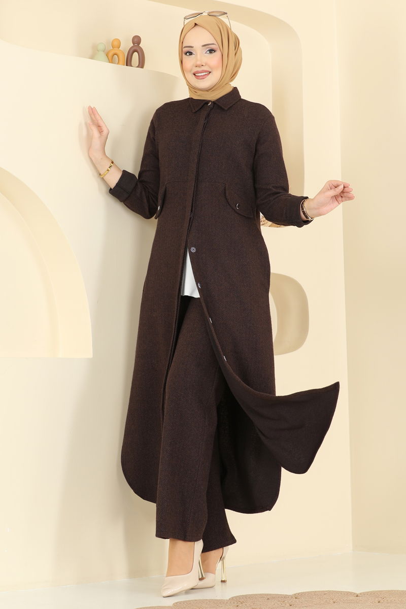 Kahve renkli ve balıksırtı desenli tesettür takım, soğuk mevsimler için idealdir. Balıksırtı motifli kumaş kullanılarak hazırlanmış bu kıyafet, hem şıklık hem de rahatlık sunar. Ürün, hafif yapıda olup gömlek yaka ve gizli düğmelerle donatılmıştır. Tunikte yan slitler ve gizli cep detayları mevcuttur; ayrıca bel kısmı dikişlidir ve pantolonun bel kısmı esnektir. Kol manşetleri düğmeli olan bu takım, aynı zamanda hassas yıkama gerektirir ve 30°C'de yıkanabilir.